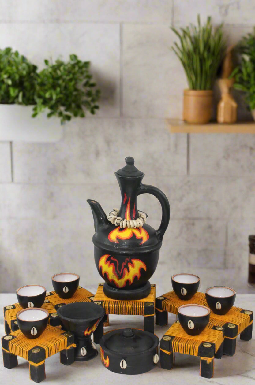 An authentic handmade Ethiopian coffee ceremony set, painted with bold flame patterns for a striking cultural look. Each piece is handcrafted, making it a one‑of‑a‑kind collector’s item. Perfect for brewing buna (traditional Ethiopian coffee) or displaying as a statement piece in your home.